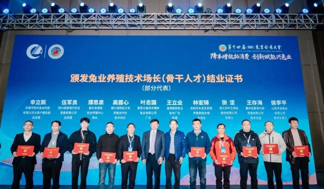 中國(guó)畜牧業(yè)協(xié)會(huì)沙玉圣秘書(shū)長(zhǎng)、中國(guó)畜牧業(yè)協(xié)會(huì)兔業(yè)技術(shù)指導(dǎo)專(zhuān)家組長(zhǎng)谷子林老師為兔業(yè)養(yǎng)殖技術(shù)場(chǎng)長(zhǎng)(骨干人才)專(zhuān)項(xiàng)培訓(xùn)計(jì)劃的優(yōu)秀學(xué)員代表頒發(fā)結(jié)業(yè)證書(shū)。